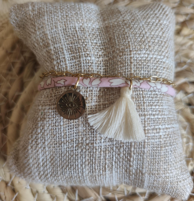 BRACELET "LIBERTY" ROSE/ BRELOQUE/POMPON BLANC 0000431